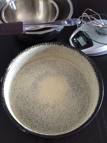Take out the short pastry and roll out with a rolling pin and a little bit of flour until the pastry is big enough so you can cover the whole spring form pan – raise to the edge.