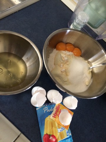 For the filling, put the quark, the vanilla pudding powder, the sugar, the sachet vanilla sugar and the egg yolks into a bowl. In another bowl put the egg whites and the pinch of salt. With an electric mixer beat the egg whites with the pinch of salt until firm. Then beat the quark mixture until you have a homogenous mixture.