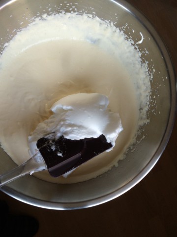 Give half of the beaten egg white into the quark mixture and incorporate softly with a spatula, then add the rest. The batter should keep the fluffy consistence given by the beaten egg whites. Be sure, you don´t have lumps of the beaten egg whites in the filling.