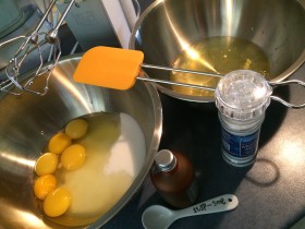 Put the two eggs and the four egg yolks into a bowl together with the sugar and the vanilla and mix until foamy.