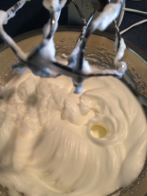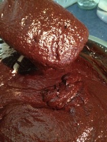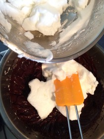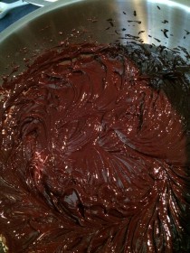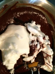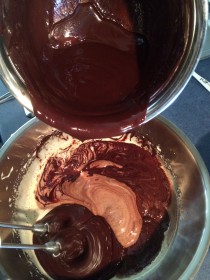 Add slowly while mixing the now a bit cooler chocolate-butter-mixture.